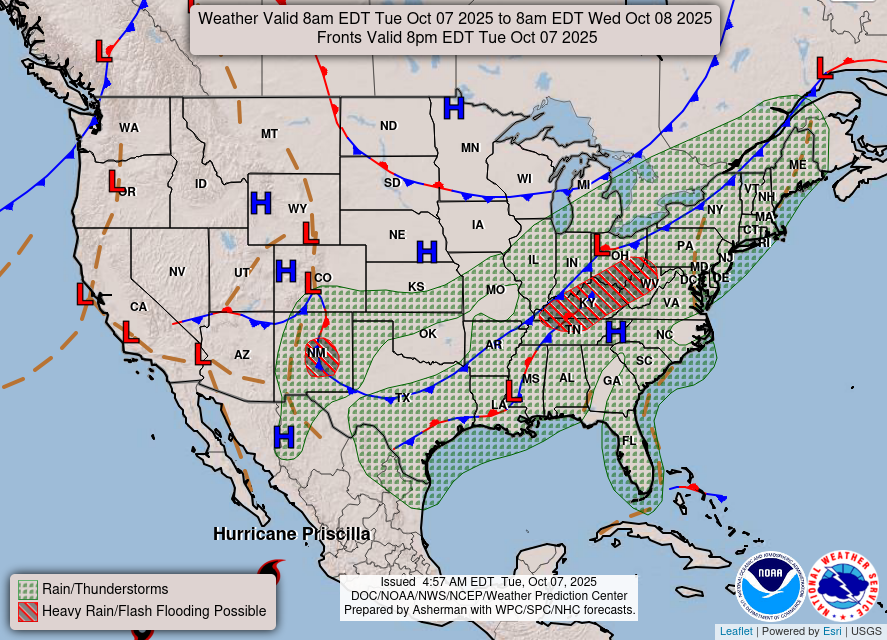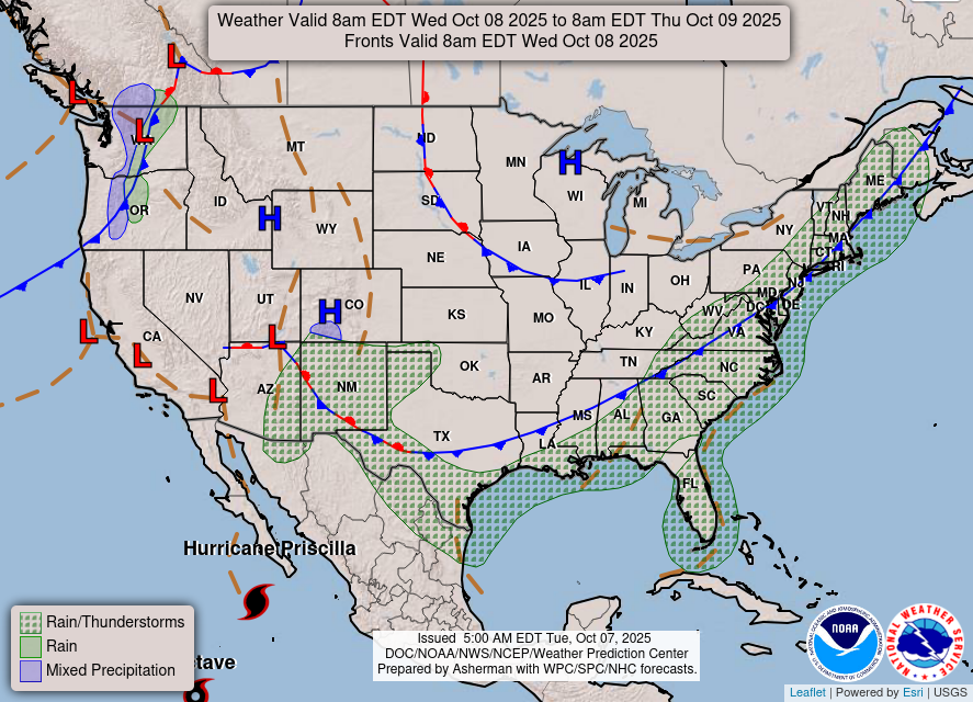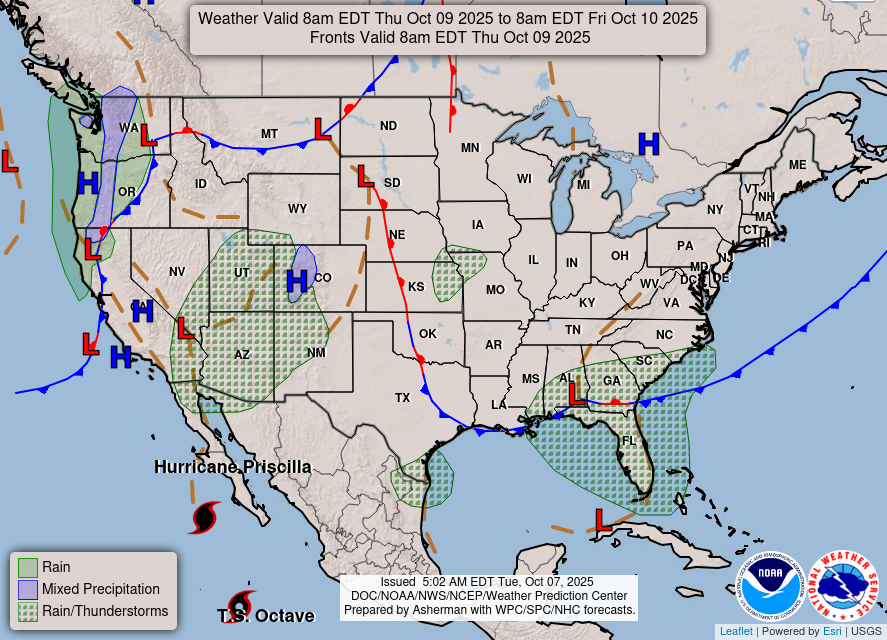 Each map ABOVE shows where precipitation is expected for a 24 hour period beginning 7 AM for the day and continuing through 7AM the following day. Fronts, highs and lows are positioned 7 PM Central Time of the same day listed.